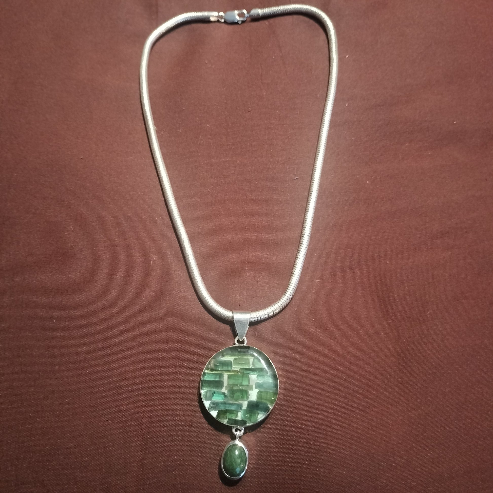 Enhance your style with this Natural Tourmaline Crystal pendant featuring a beautiful Jade cabochon set in sterling silver. The tourmaline crystals, encased in resin, add a touch of natural beauty while the 16 inch 3mm snake chain with lobster claw clasp ensures secure and comfortable wear.Sterling Silver 16 inch snake chain and pendant with natural Tourmaline crystals in resin and jade all bezel set