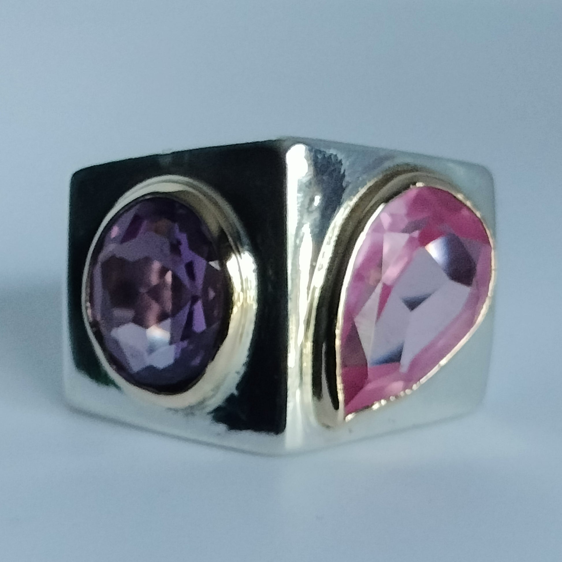 Expertly crafted with 12.5 grams of sterling silver, this size 6.5 ring showcases a stunning 18mm top adorned with 9 carats of created pink and purple sapphires. Each bezel set in 10k yellow gold, this estate piece exudes elegance and sophistication.