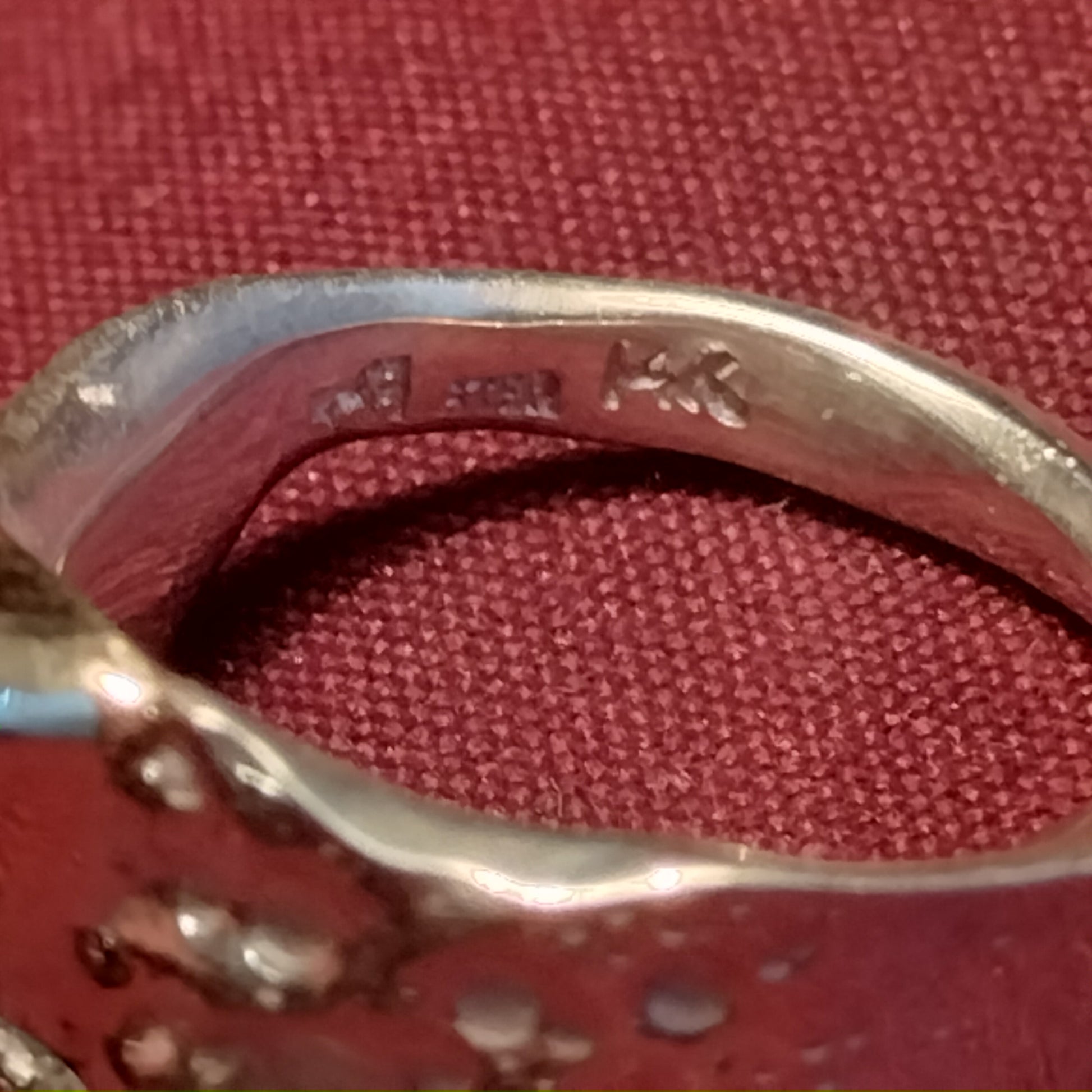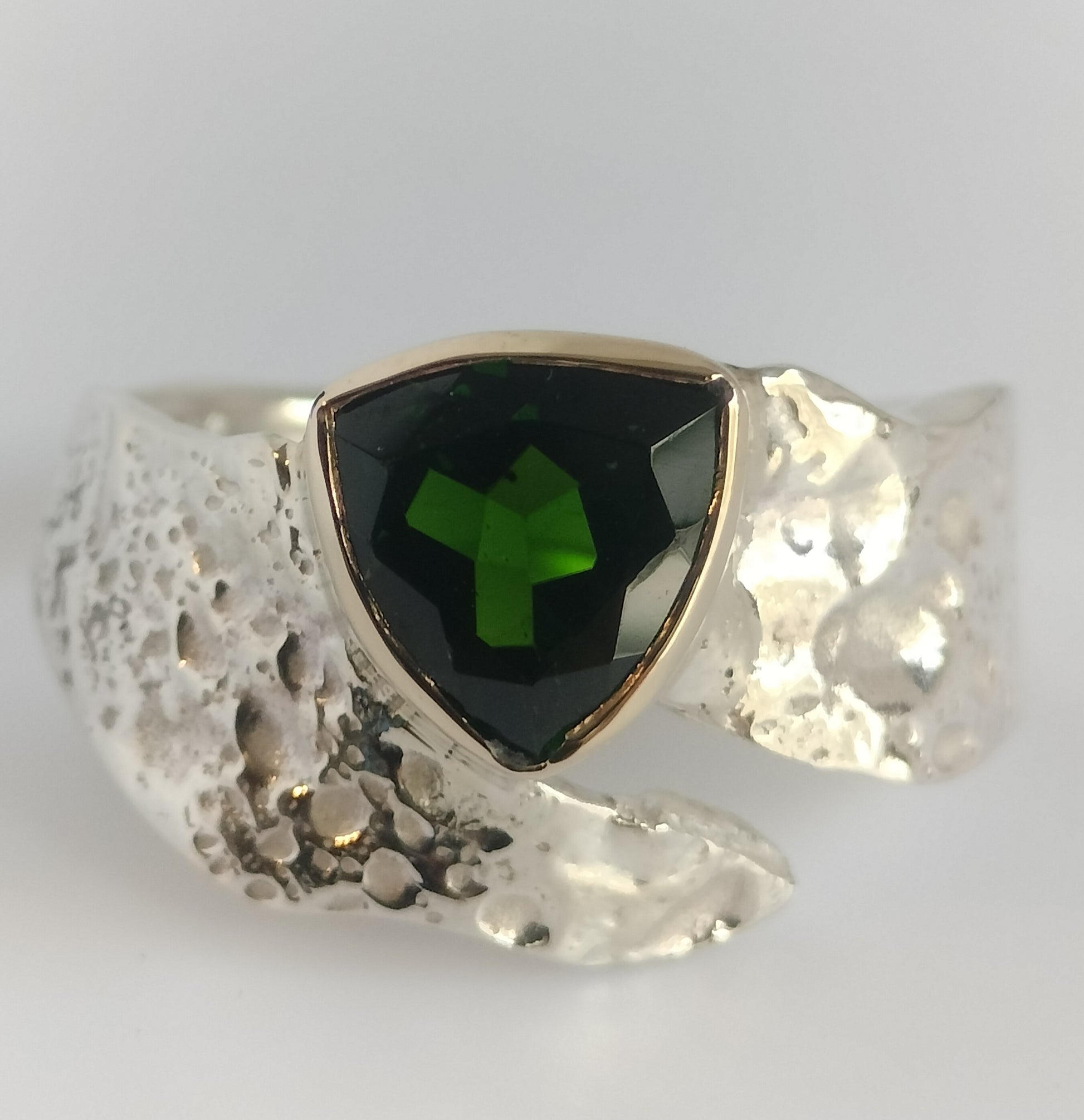 This handmade Brutalist-style ring is crafted with sterling silver and accented with a 14k gold bezel, boasting a total weight of 6.9 grams. The natural chrome Diopside, cut in a unique trillion shape, adds a touch of elegance and measures 1.8 carats. Expertly crafted by artist Tanean Bijl, this ring is a stunning addition to any collection.