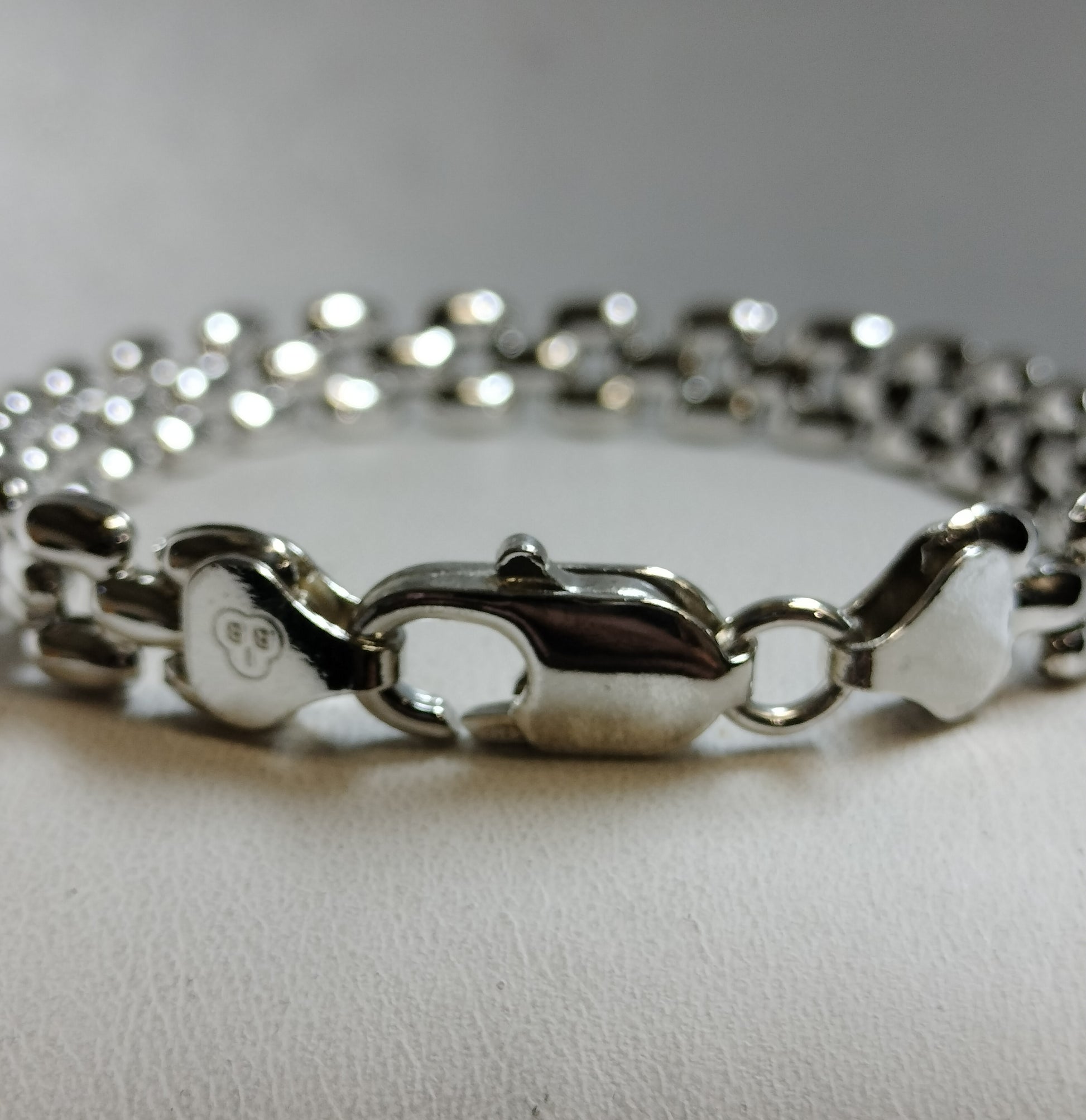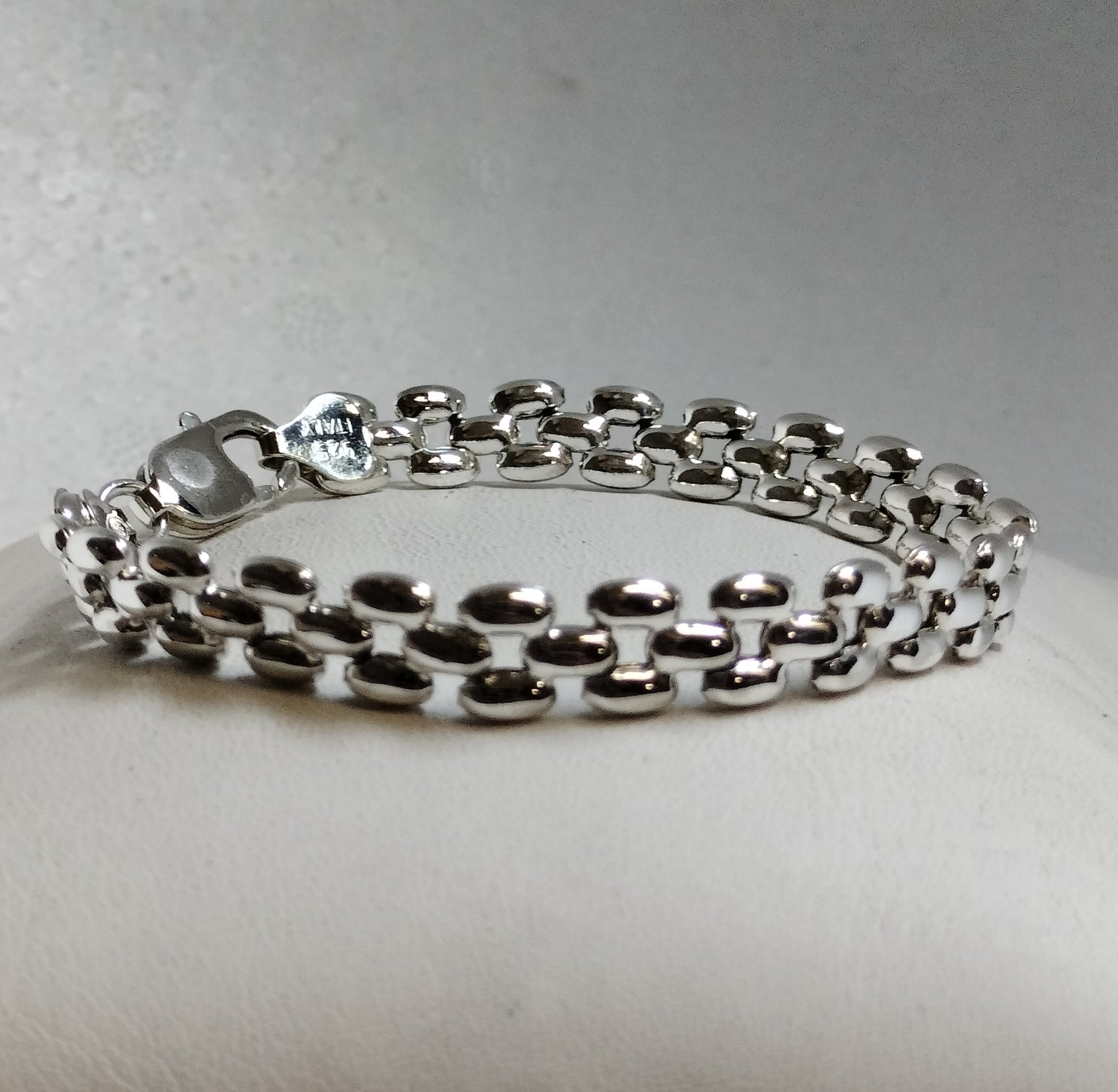 Crafted with 7.9 grams of quality sterling silver, this 8mm brick link bracelet measures 7.25 inches and features a secure lobster clasp. A timeless and elegant addition to any jewelry collection, perfect for daily wear or special occasions. Experience the luxurious look and feel of estate jewelry with this exquisite bracelet.