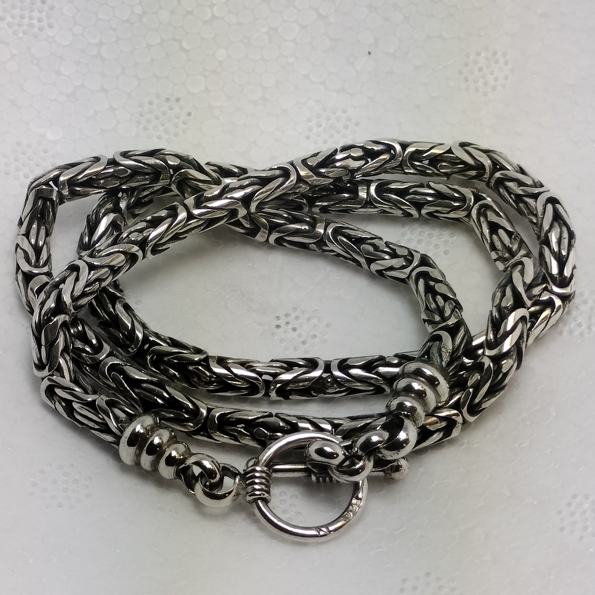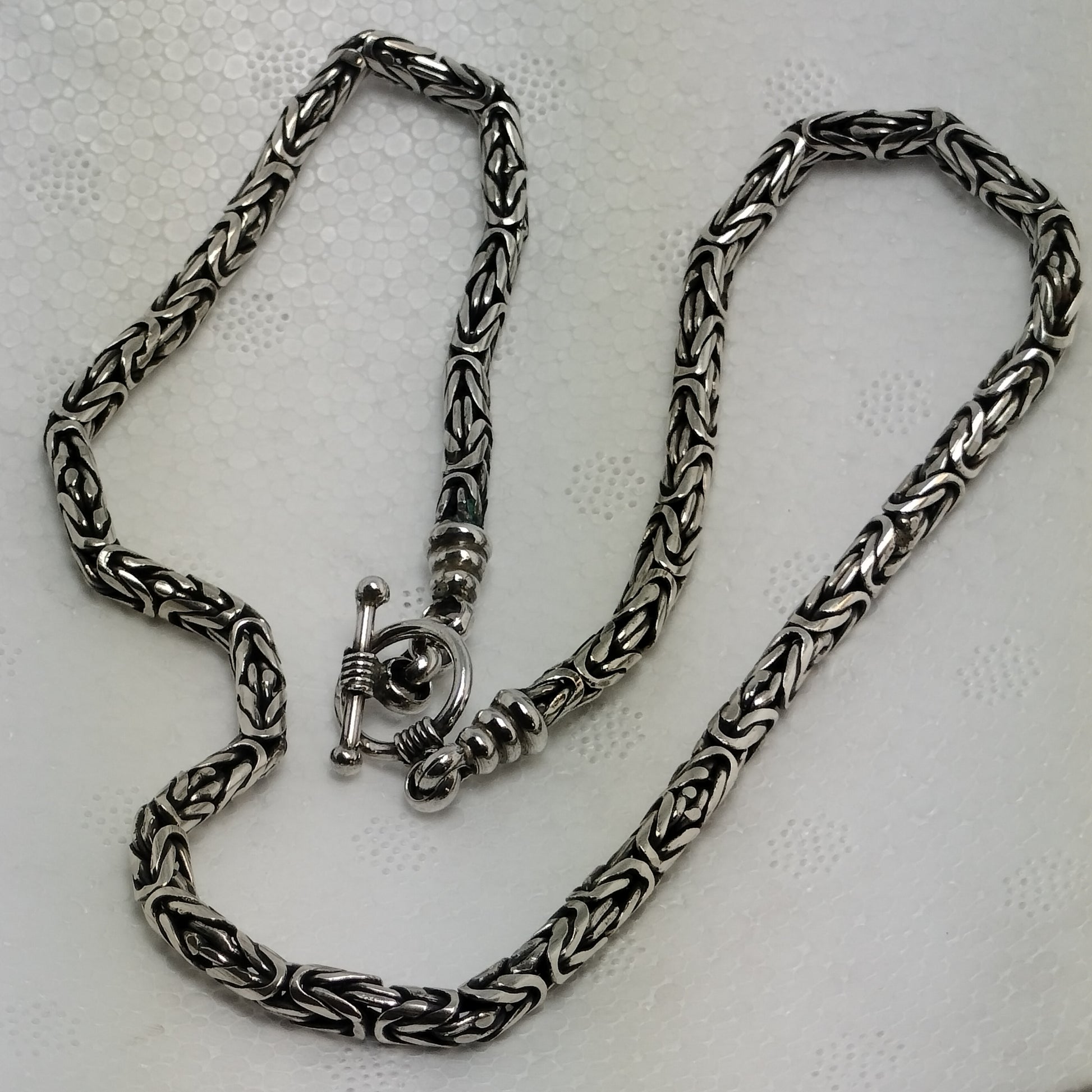 Expertly crafted from high-quality sterling silver, this Byzantine necklace is an elegant addition to any jewelry collection. With a substantial weight of 41.4 grams and a thickness of 5mm, it exudes luxury and durability. The 18-inch length and toggle clasp make it versatile and easy to wear. A timeless piece with a touch of estate charm.