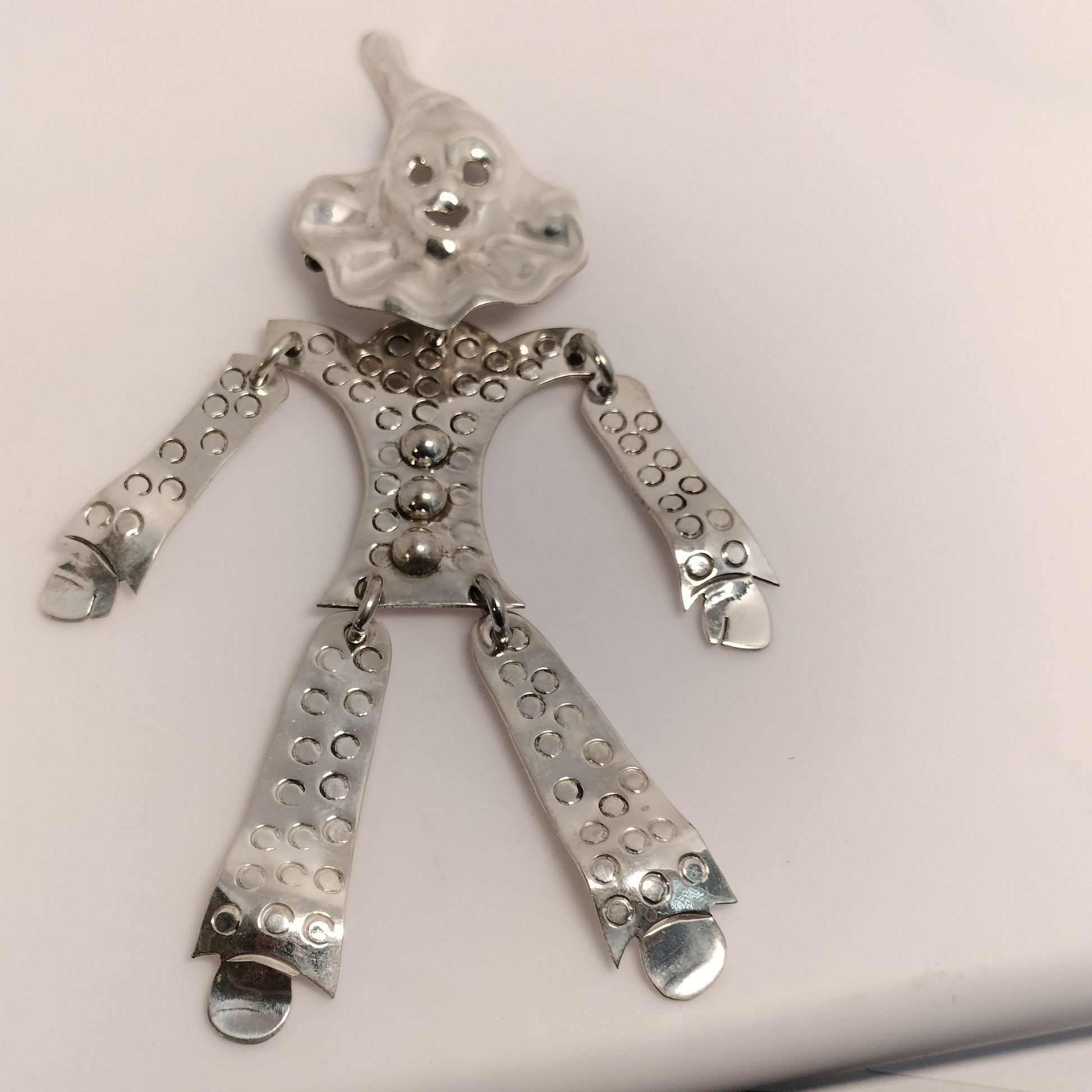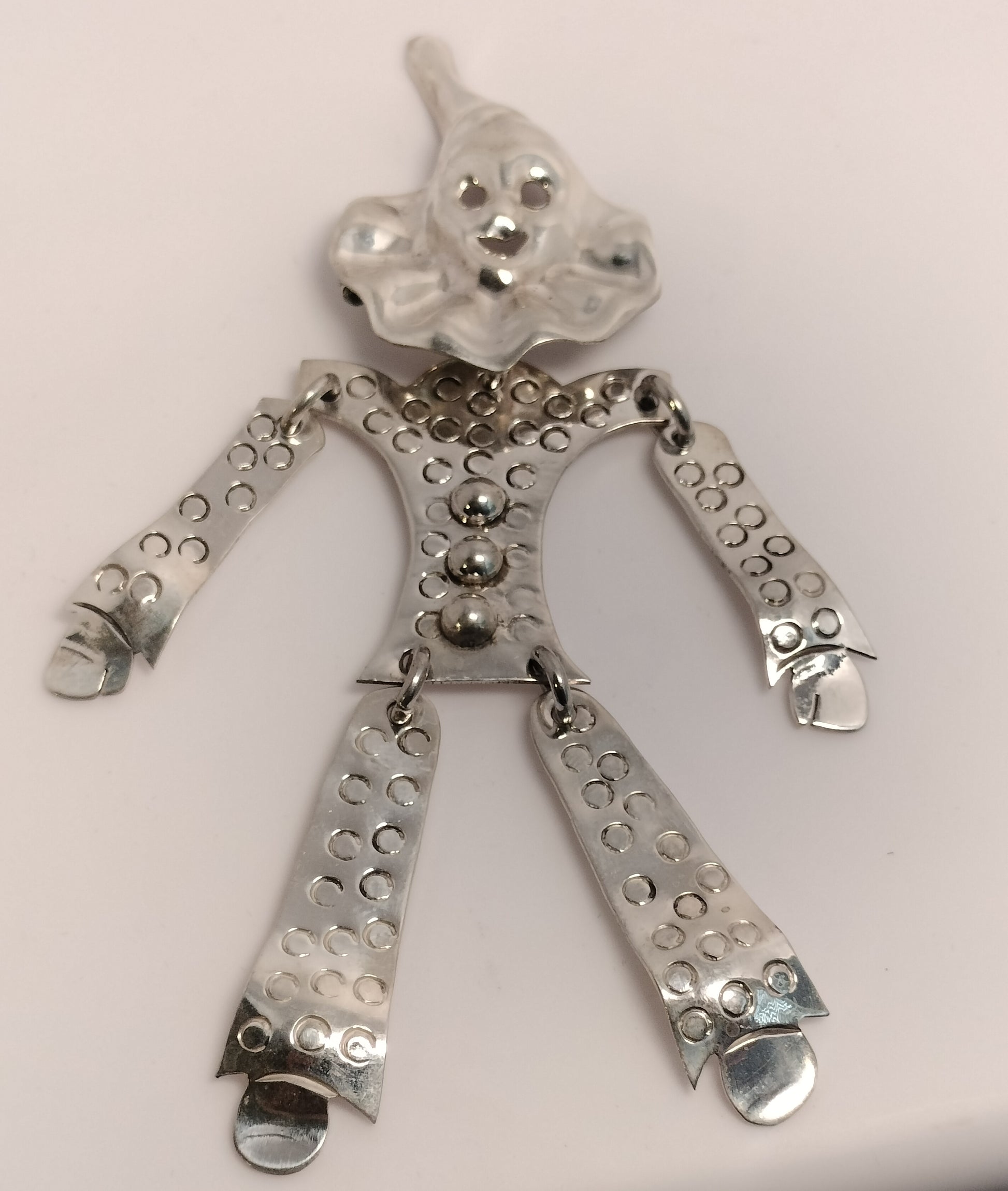 This Sterling Silver Clown Brooch is a unique addition to any jewelry collection. Measuring 5 inches long and 1.5 inches wide, this estate piece is a statement of quality and style. With a weight of 24.7 grams, it is a substantial and eye-catching accessory.
