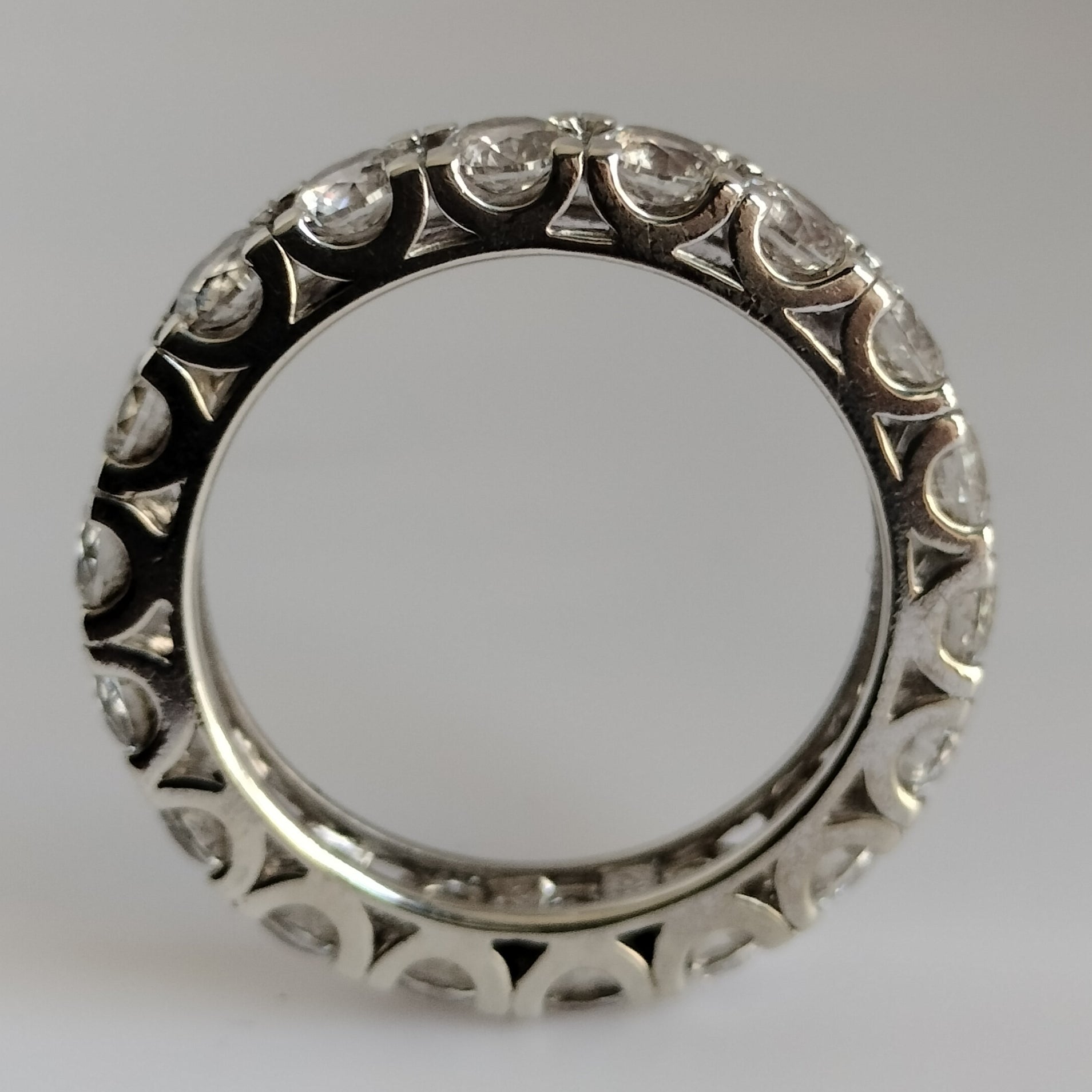 Expertly crafted in 925 sterling silver, this estate eternity band features a stunning 3.5 carat total weight of sparkling cubic zirconia stones. At a size 7 with a 3.5mm width, this 3.8 gram band offers timeless elegance and exceptional quality. Perfect for adding a touch of luxury to any wardrobe.