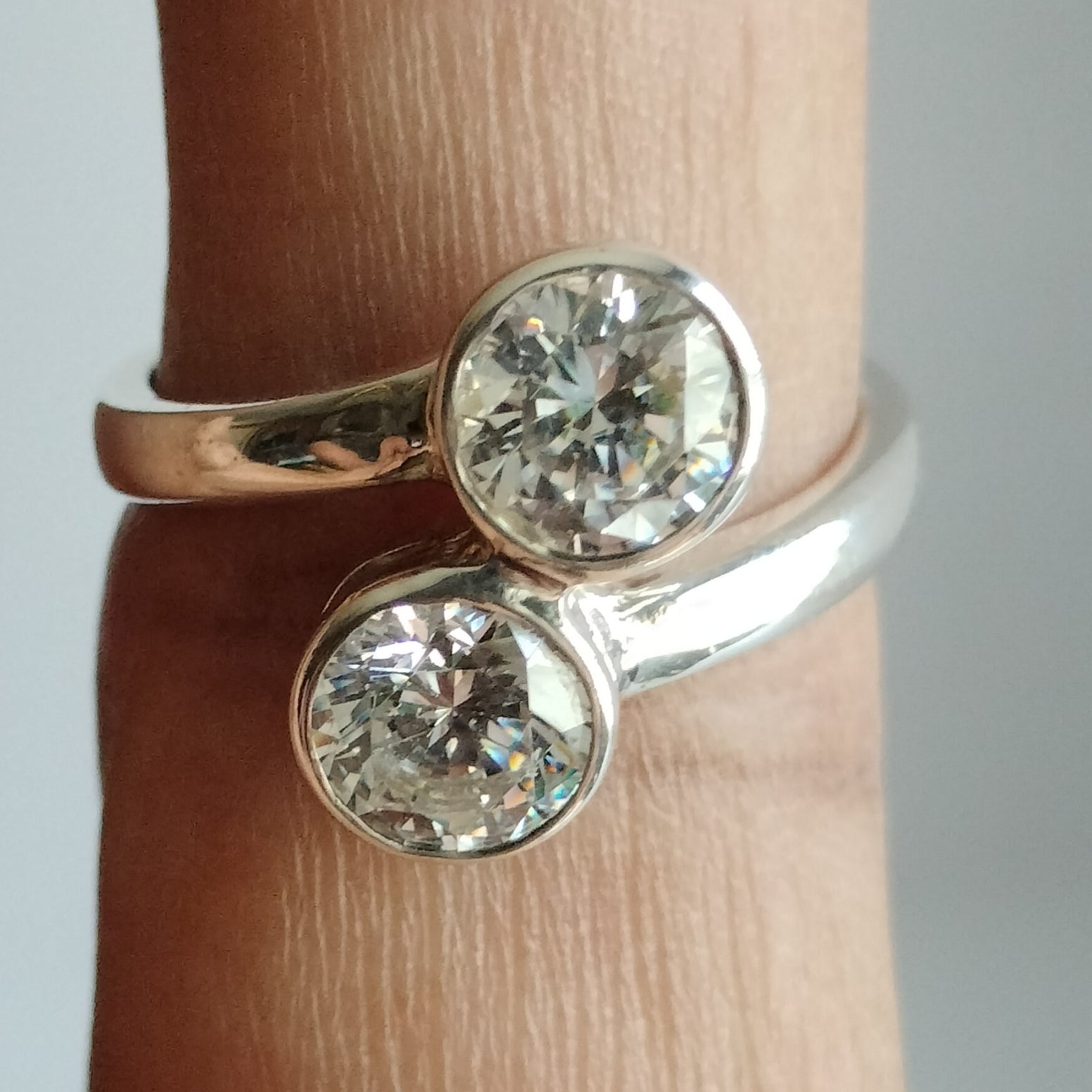This elegant Sterling Silver Cubic Zirconia Ring boasts a 13.5mm top and a sparkling 2 carat total weight. The twin bypass design adds a touch of sophistication to this ring, making it the perfect accessory for any occasion. At only 3.6 grams, it is both lightweight and comfortable to wear. Available in a size 5.75, this ring is a stunning addition to any jewelry collection.
