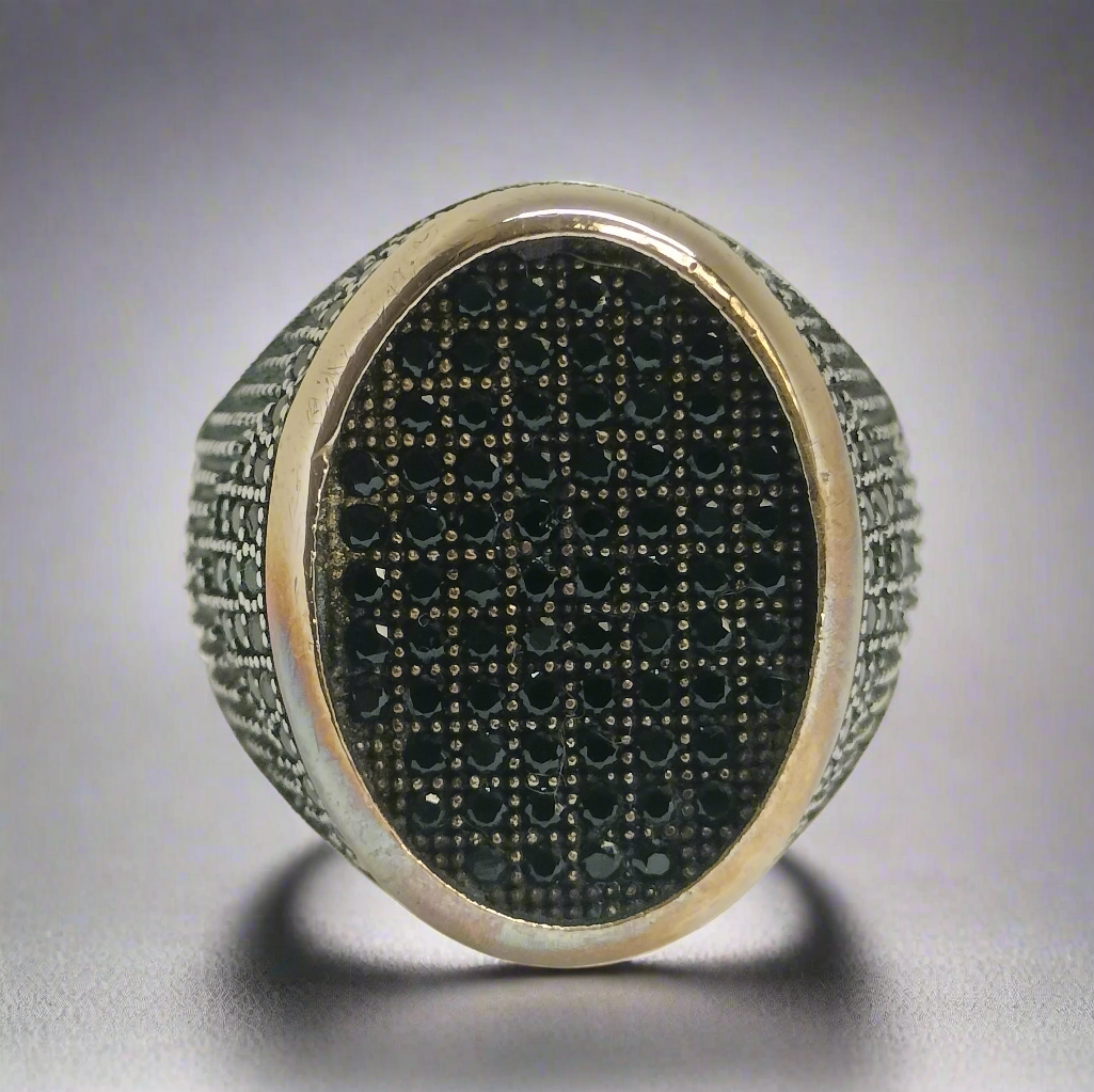 Expertly crafted from sterling silver and featuring a stunning 2 carat total weight black cubic zirconia, this size 10 ring is the perfect addition to any estate jewelry collection. The 15.1 gram weight ensures a high-quality, substantial feel when worn, and the delicate gold overlay adds an elegant touch. Add this timeless piece to your collection today.