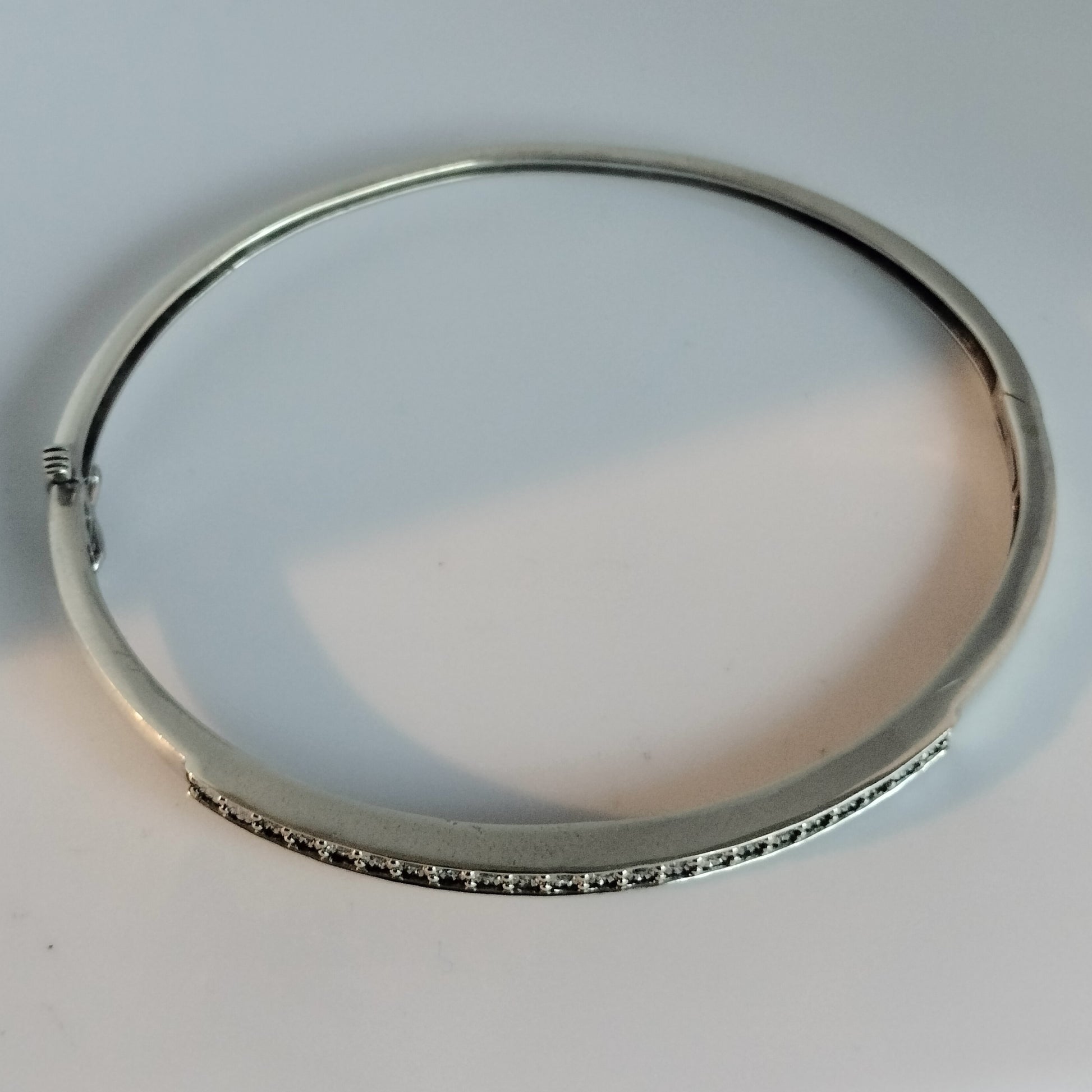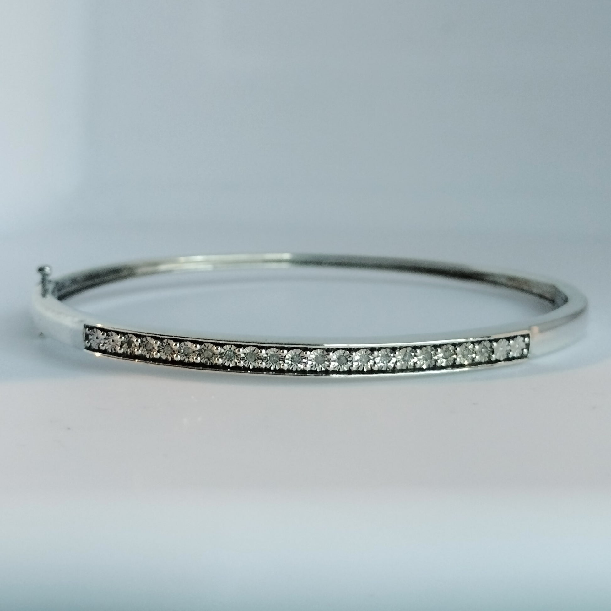 This 7 inch Sterling Silver Diamond Bangle Bracelet weighs 9.6 grams and boasts a sleek 4mm design. The stunning bangle is adorned with .15 carats of natural diamonds, adding a touch of elegance to any outfit. Perfect for a night out or special occasion.