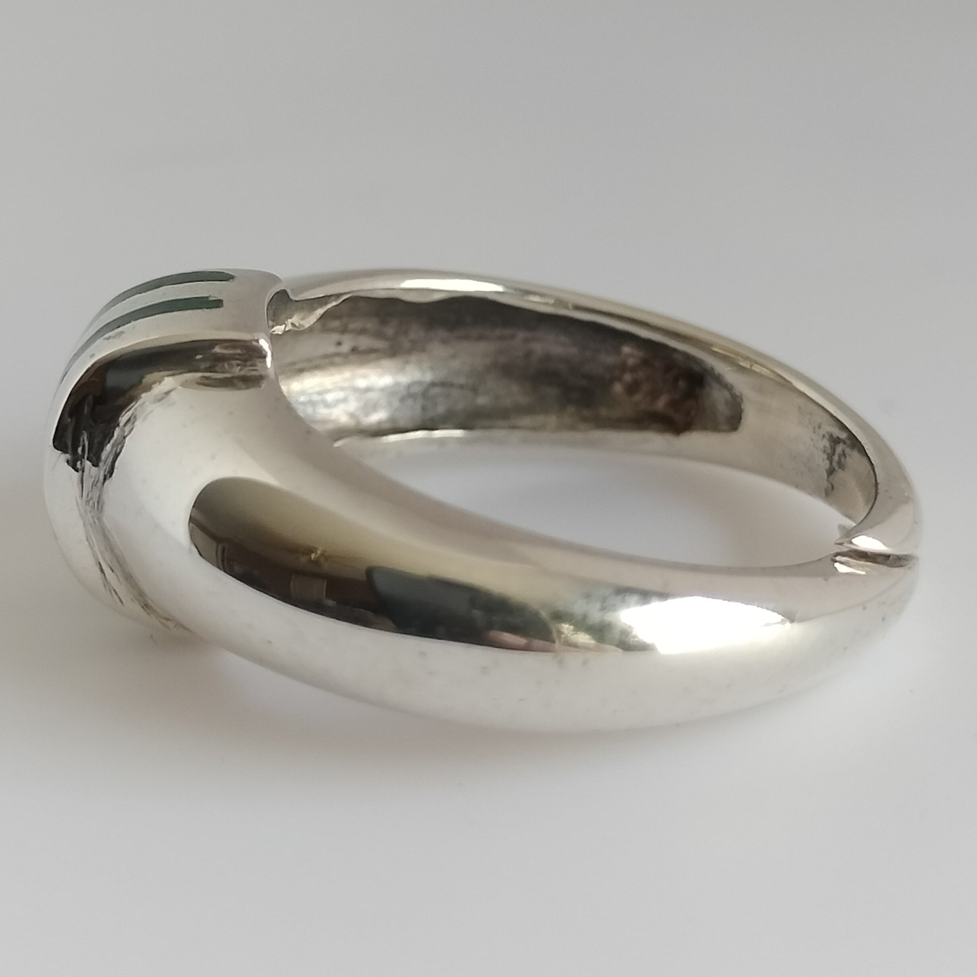 Expertly crafted and beautifully detailed, this Sterling Silver Enamel Ring features a vibrant green enamel inlay for a touch of color. Weighing 5.8 grams and with an adjustable size of 5.75, this estate piece is sure to make a statement with its 9.5mm top. Elevate your jewelry collection with this stunning ring.