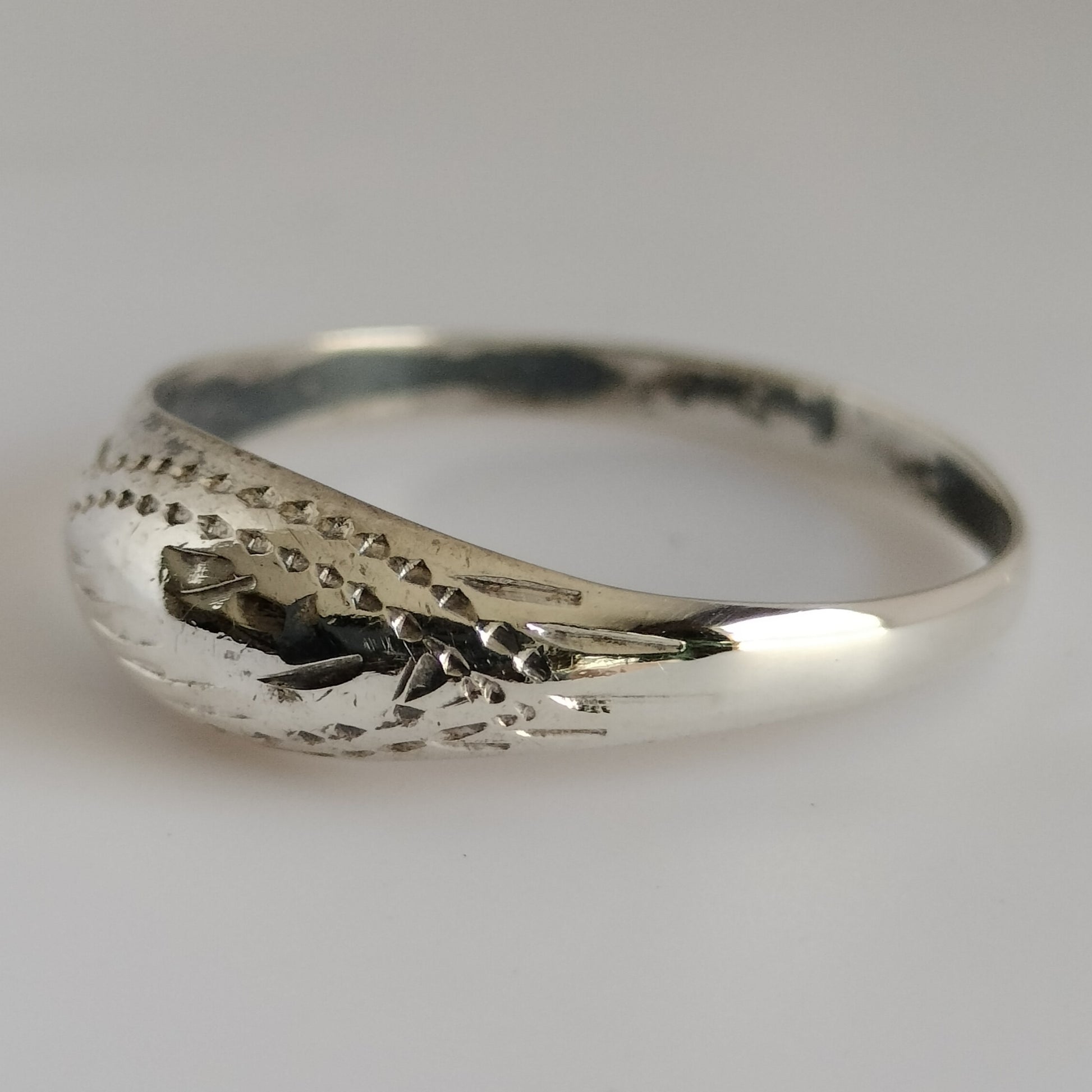 This elegant sterling silver ring weighs 1 gram and features an engraved design. With a size 8 fit and a 5.75mm top, it adds a touch of sophistication to any outfit. Perfect for adding to your estate jewelry collection.