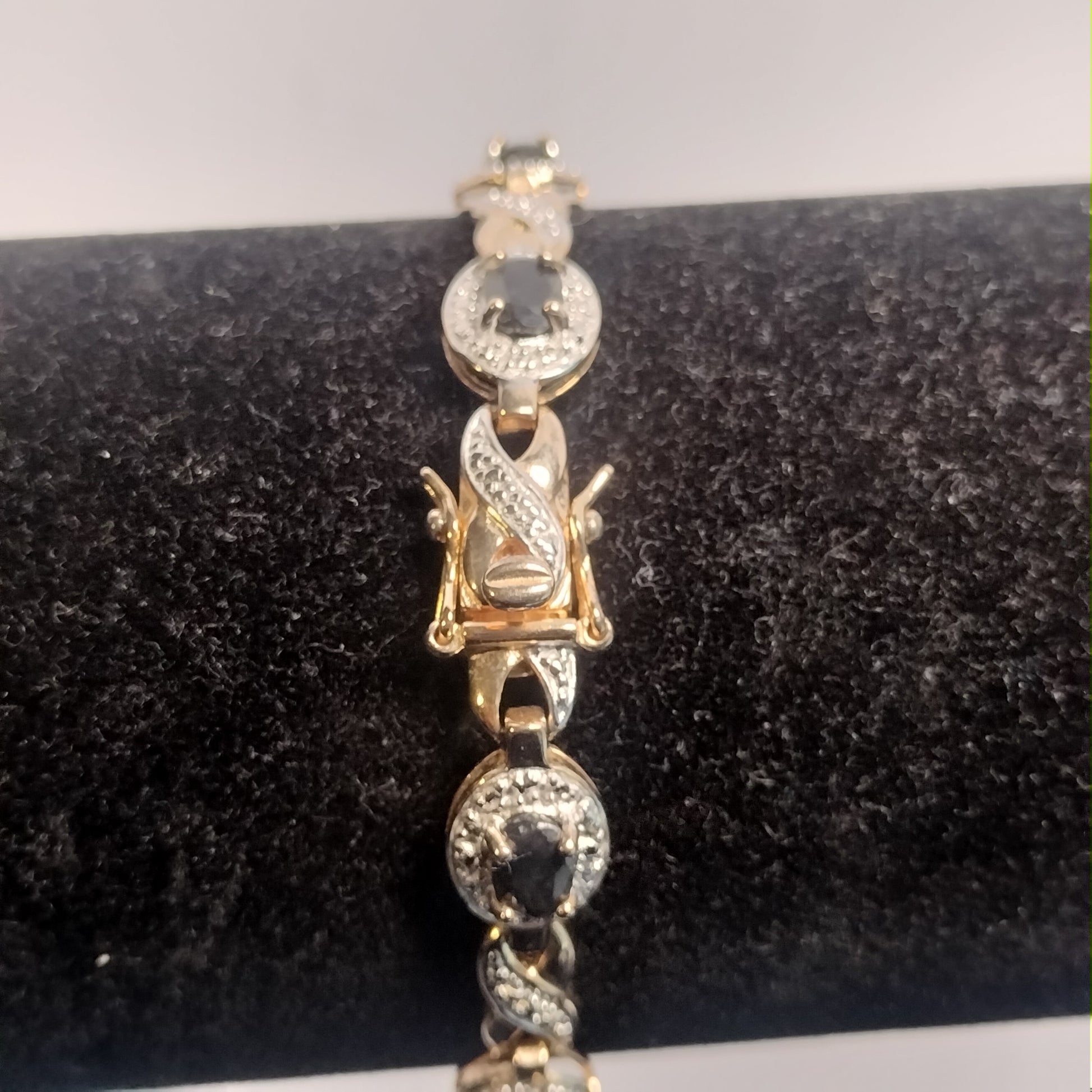 This elegant Sterling Silver Sapphire and Diamond Tennis Bracelet features 4 carats of natural sapphires and a .015 carat diamond, adding a touch of sophistication to any outfit. The gold overlay and hidden box clasp provide a secure and stylish fit. With 8mm stones and a total weight of 11 grams, this 7.5 inch bracelet is a timeless addition to your estate jewelry collection.