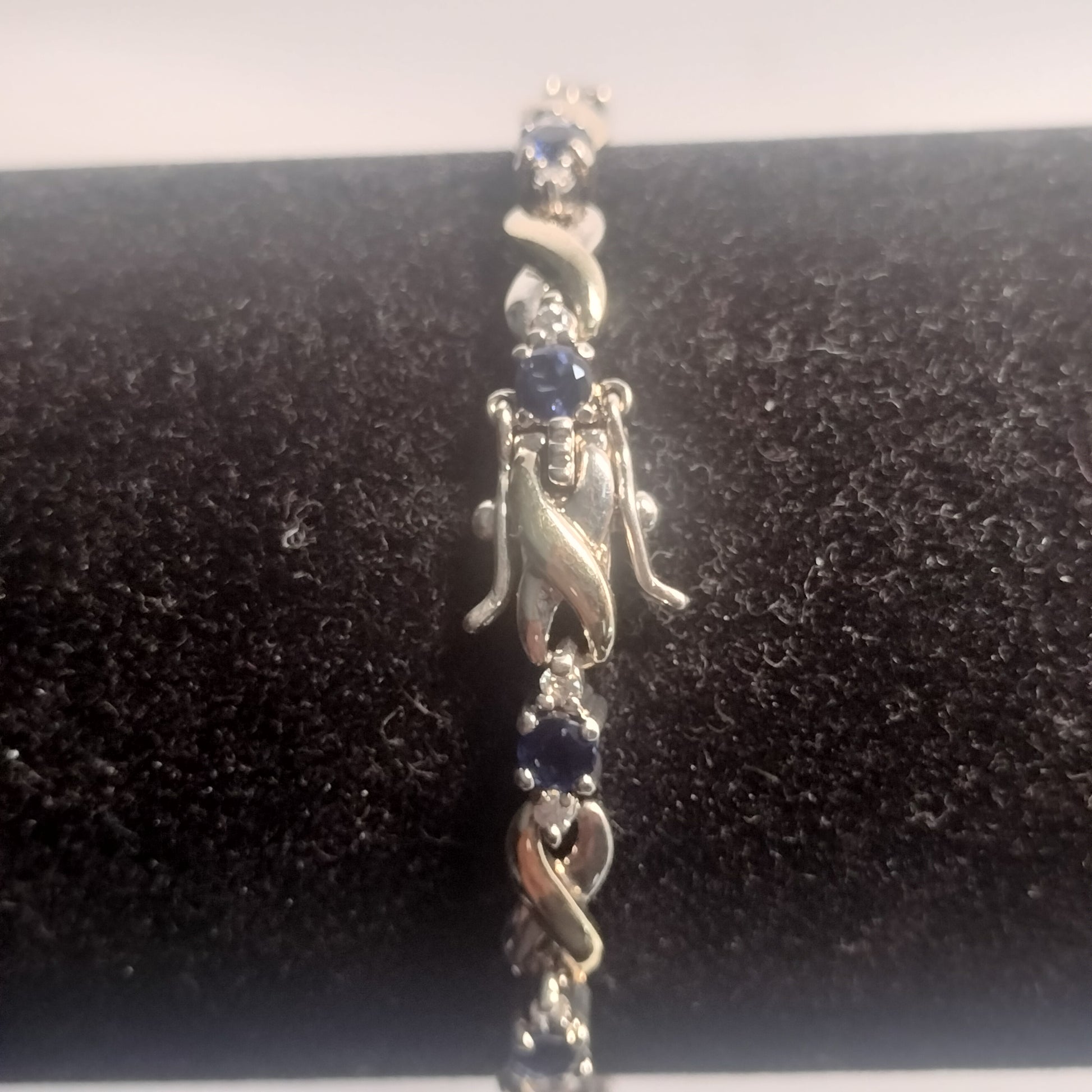 This beautiful estate bracelet, crafted with sterling silver and gold overlay, boasts a stunning 7 inch design. Adorned with created sapphire stones and sparkling cubic Zirconias, it adds a touch of elegance to any outfit. Perfect for a special occasion or everyday wear, this 10.5 gram tennis bracelet is a must-have for any jewelry collection.