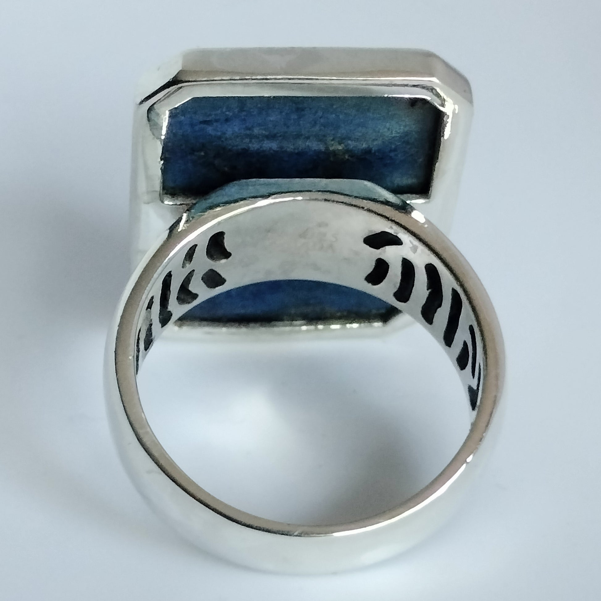 Expertly crafted in sterling silver, this 13.7 gram ring features a stunning 26mm top adorned with natural bezel-set gemstones. With vibrant turquoise and lapis stones, this estate piece is a size 8.75 and is guaranteed to make a statement. Add a touch of elegance to any outfit with this beautiful ring.