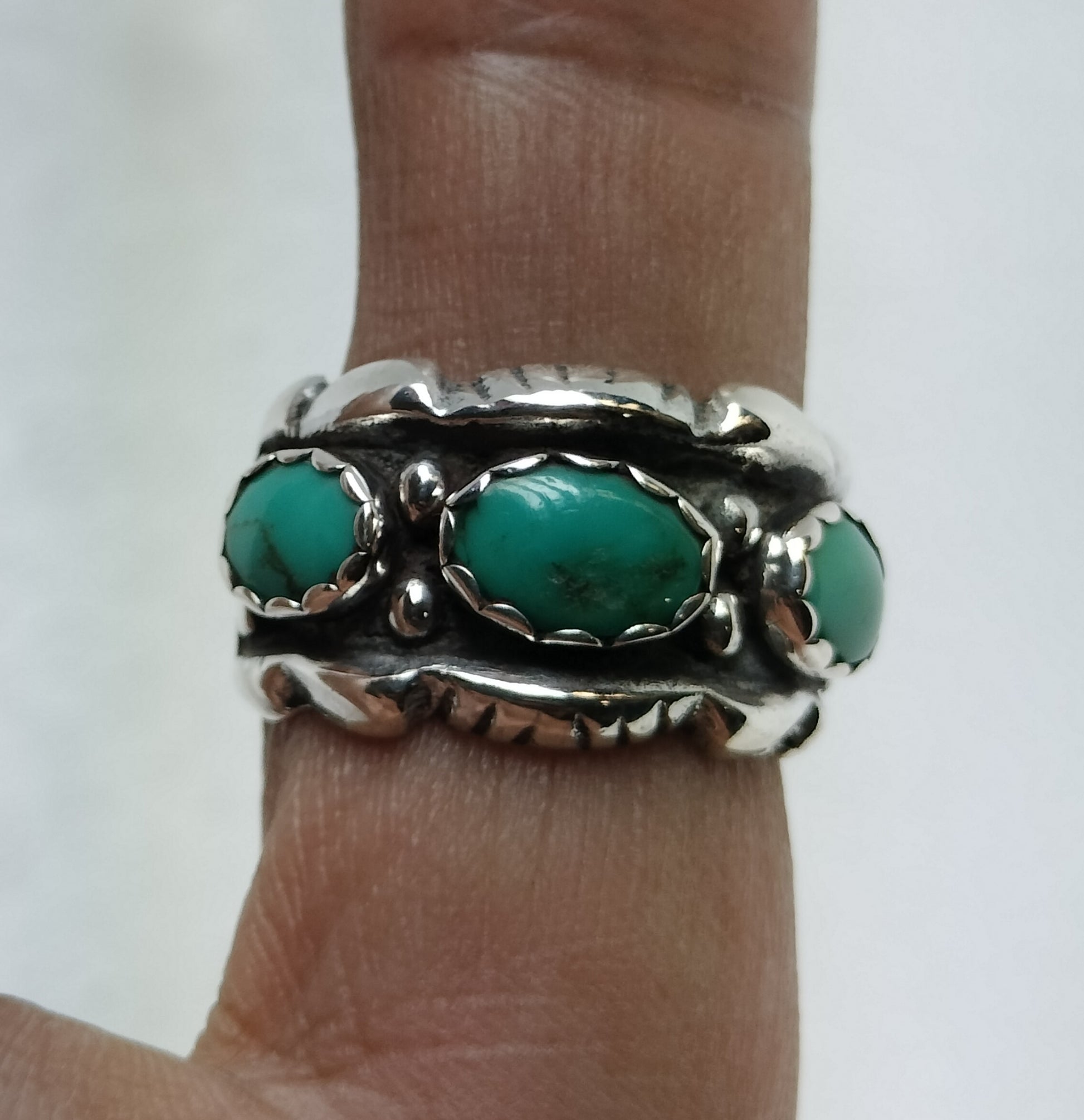 This vintage estate ring boasts unique bezel-set natural turquoise gems, providing a timeless and sophisticated look. With a weight of 5.8 grams and a size of 6.5, it is the perfect addition to any jewelry collection. The 12.6mm wide top adds a touch of elegance, making it a must-have for any fashion-forward individual.